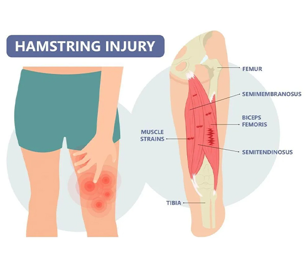 Localised Pain: Hamstring strains are usually caused by insufficient warm-up before exercise or overexertion (exceeding the body’s capacity), leading to muscle fibre damage and causing localised pain.